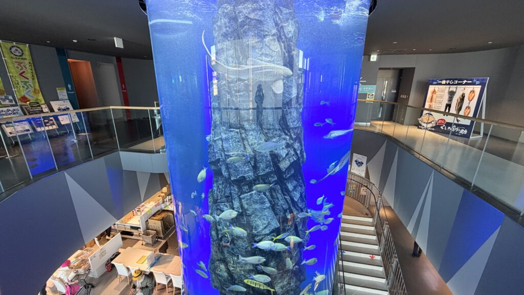入口にはいきなり巨大水槽が!なんと高さ8m!2階からも見られるので、じっくりゆっくり見学できました。