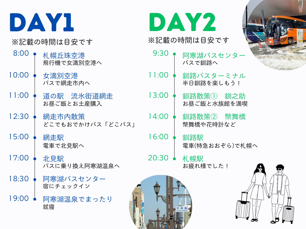 今回の行程はご覧の通りで、飛行機にバス、電車を活用して「網走・阿寒・釧路」を満喫してきます。