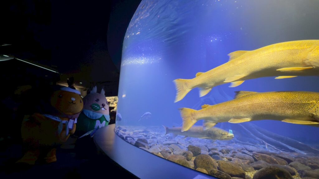 最大2メートルにもなる日本最大級の淡水魚イトウは、今は北海道の一部でしか生息していないんだって!北の大地の水族館では温根湯の地下水で育った1メートル級のイトウが10匹もいるんだよ~(と、ミントくんは伝えてくれた)