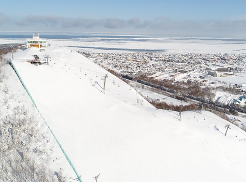 オホーツク沿岸の枝幸町にある、町営のスキー場。2月初旬からは、遠くロシアからオホーツク海にやってくる流氷を見ながら滑ることができる、北海道のスキー場の中でも珍しいゲレンデです。