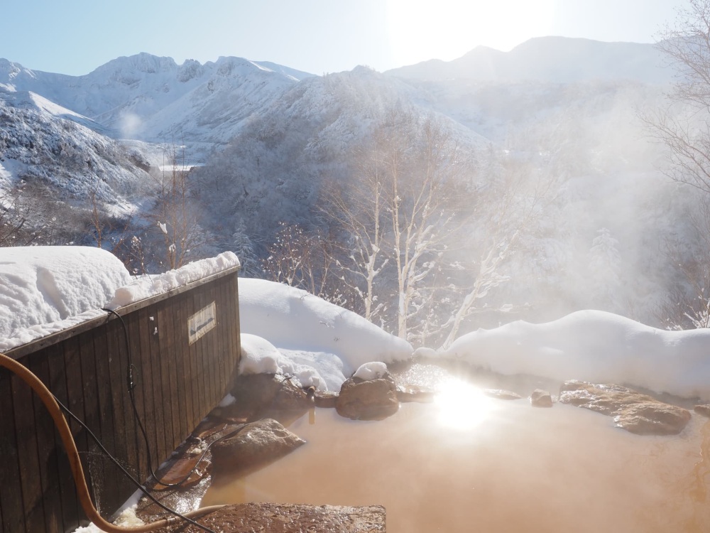 十勝岳温泉の凌雲閣は、北海道で最も標高が高い場所にある温泉として知られています。源泉は2本で、32.1度の1号井と51.1度の2号井をかけ流しで使っています。2号井は鉄がさびたような鮮やかな茶色なのに対し、1号井は酸性ながら無色透明の優しい肌あたりで、温泉と気づかない人もいるそう。1号井の湯船はプールの温度に近い29度の「低温浴」。温度の高い湯船と交互に入ることで血管の収縮が起こり、より血行が良くなって体が温まります。