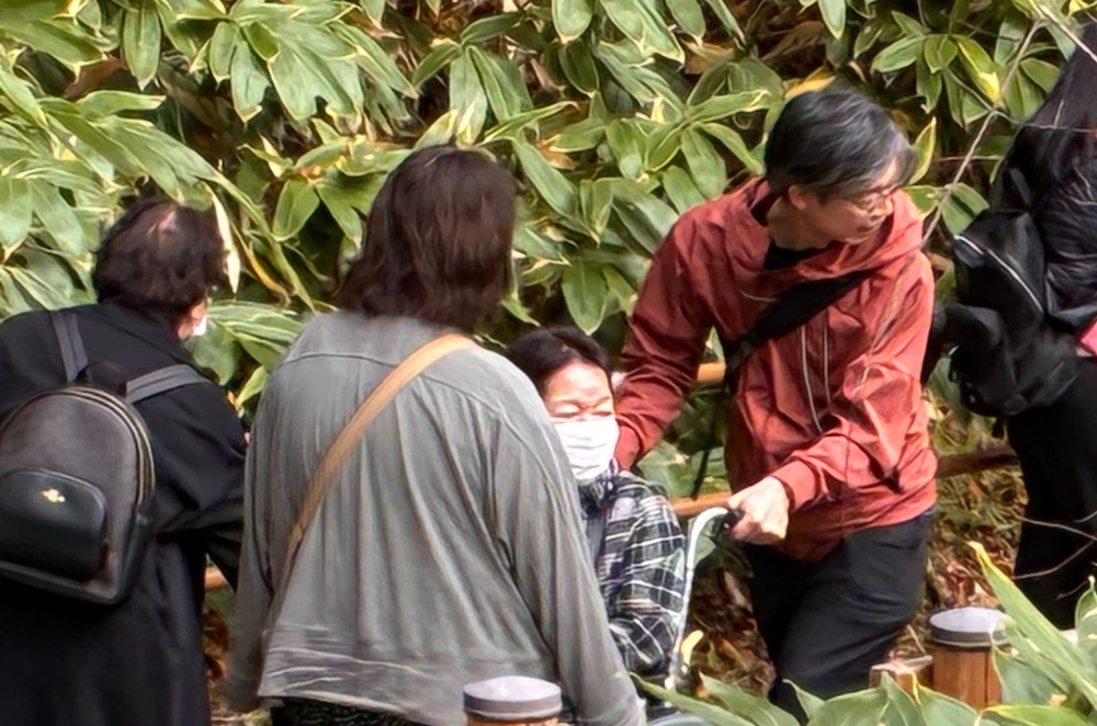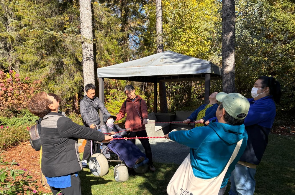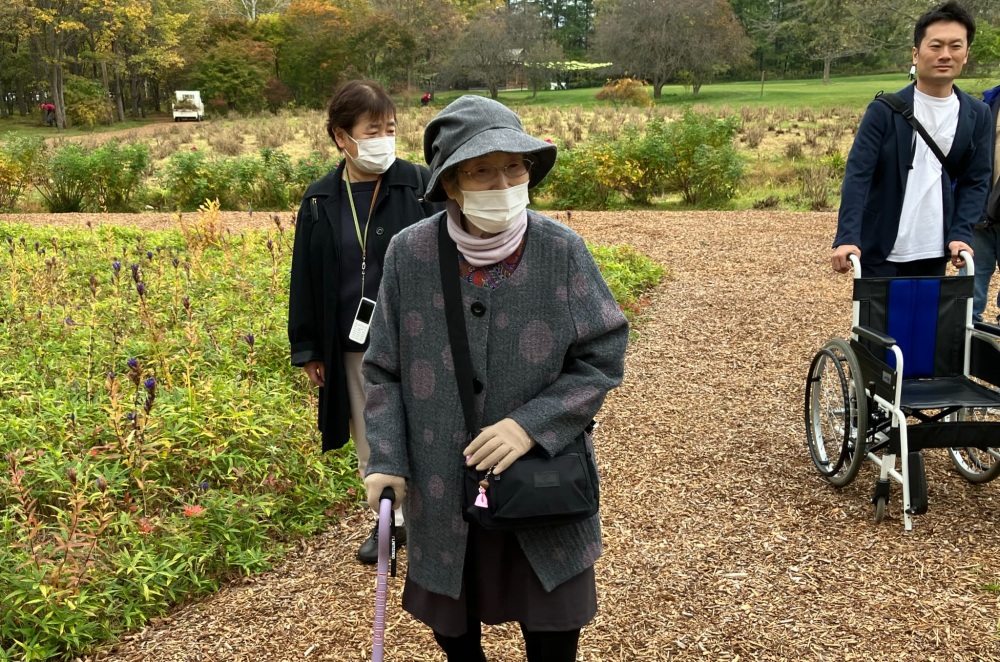 当初、レスパイトコースの参加者はホテルで休養の予定でしたが、「リハビリコースに同行したい」との希望があり、全員で帯広市の「真鍋庭園」に出発しました。現地では車椅子対応のバギーチェアを活用し、散策と屋外プログラムを実施しました。