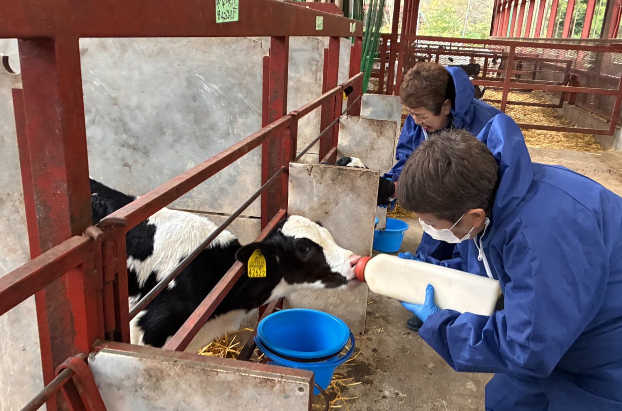 続いては、士幌町の「山岸牧場」に場所を移しての動物セラピー体験です。牧場主の奥様から動物との関わり方や命を育む現場の話を聞き、その後子牛へのミルクやり体験を行いました。