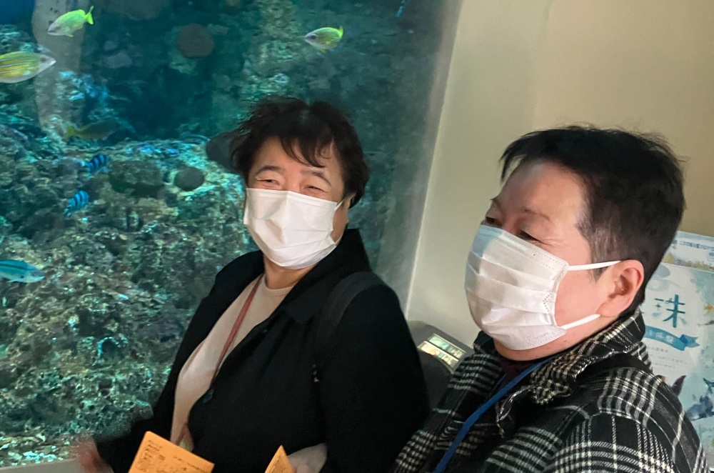 初日のリハビリコースでは、登別市にある人気水族館「登別マリンパークニクス」を訪れました。参加者は、水槽の中を泳ぐ生き物の動きや光・音の刺激を楽しむうちに自然と笑顔になり、落ち着いた雰囲気で観覧していました。