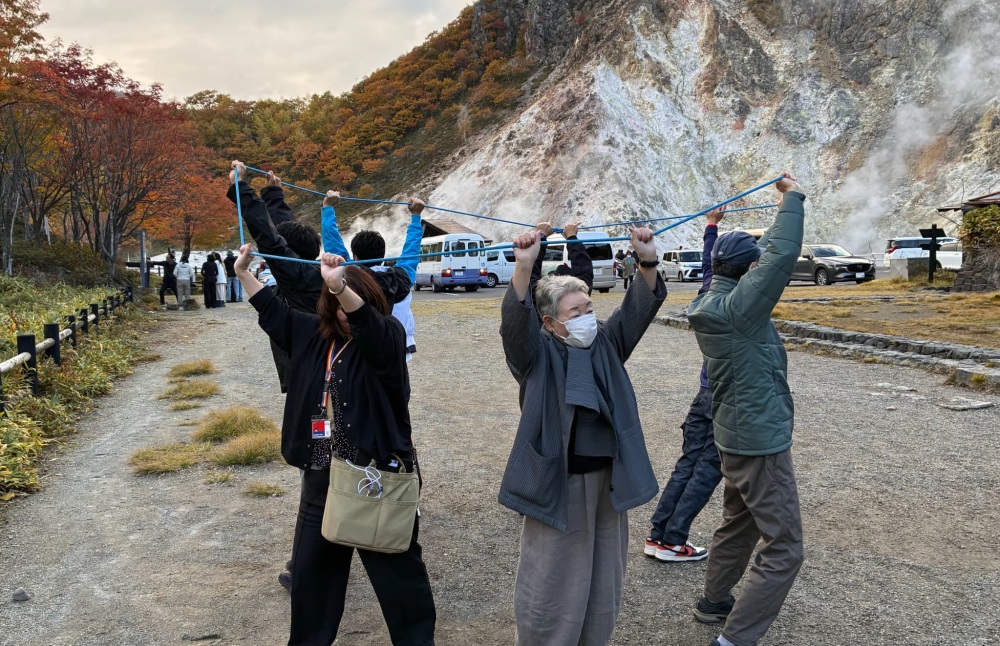 初日のレスパイトコースでは、登別温泉の「地獄谷」から「大湯沼」までの山道ウォーキングを行いました。温泉地特有の傾斜や地熱環境を活かした、歩行トレーニングと脳活性プログラムです。途中では、上肢筋を刺激するストレッチ運動も取り入れました。