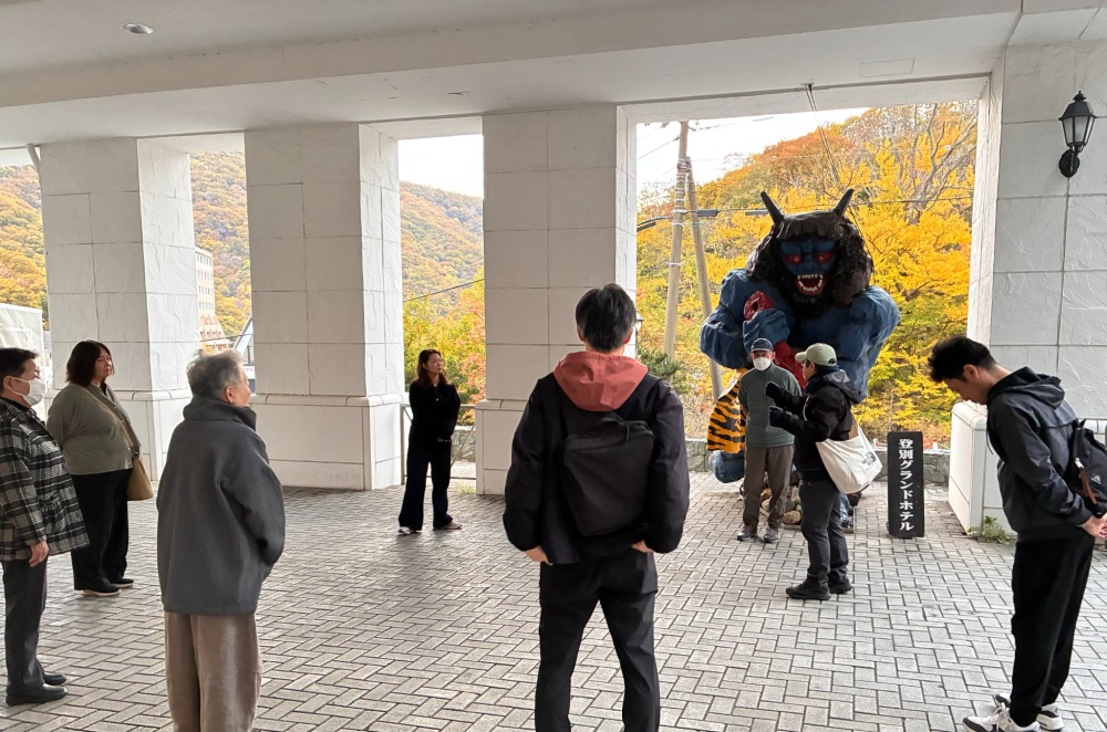 朝食前に、登別温泉街でモーニングアクティビティを行いました。ホテル前の緩やかな坂道や温泉街の平地を活用し、呼吸を整えながらのウォーキング。リハビリコースの参加者も平地では車いすを降り、自らの足で歩行に挑戦しました。