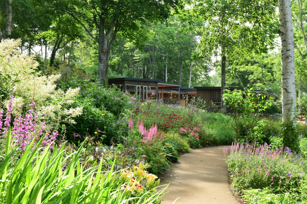 帯広で創業した人気菓子店六花亭が運営する六花の森では、六花亭の花柄包装紙に描かれた山野草が庭園いっぱいに咲き誇ります。庭園内には、包装紙の絵を描いた坂本直行氏の作品や彫刻など、自然とアートが調和した空間が広がっています。