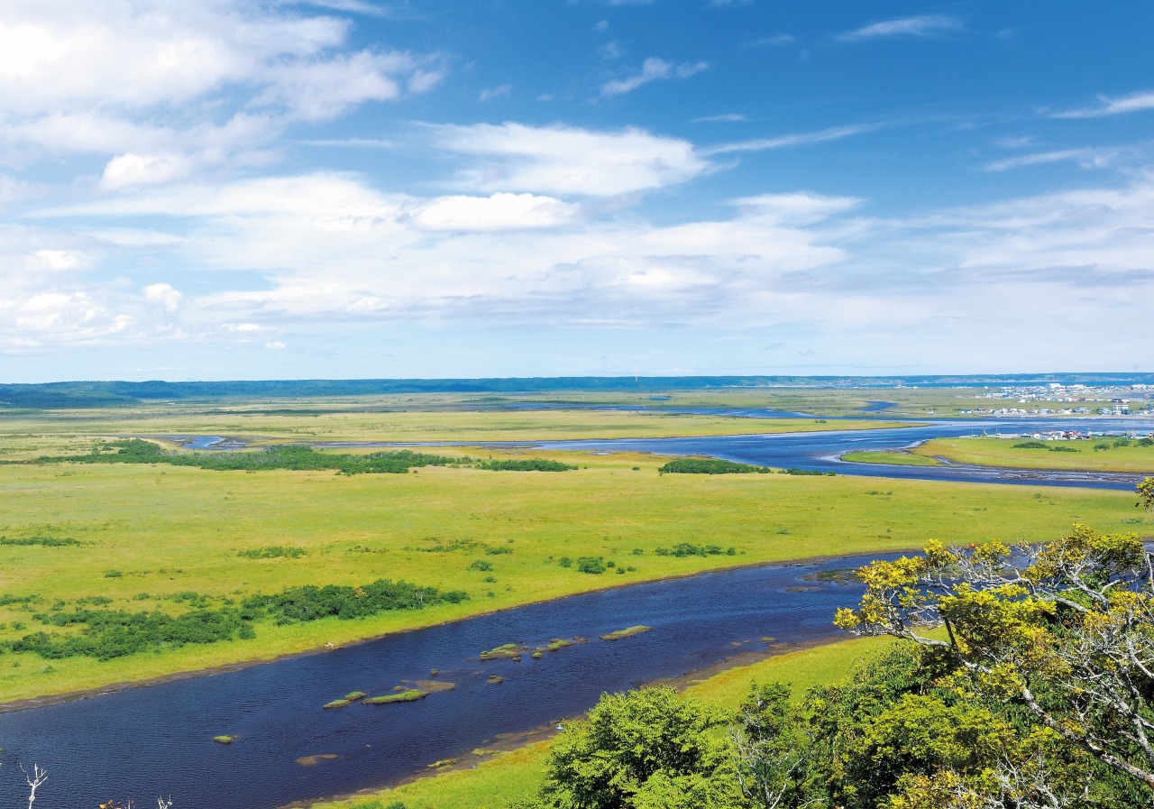 霧多布湿原の南の高台にある展望台。北側には広大な霧多布湿原の中を琵琶瀬川が蛇行する大パノラマが、南側には太平洋の大海原が続く360度の視界が広がる絶景スポットです。