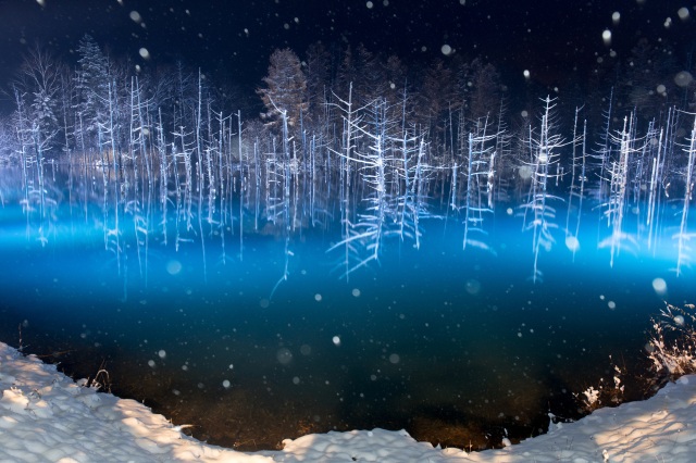 白ひげの滝などから湧き出るアルミニウムを含んだ地下水が美瑛川と混ざり合い、その水に太陽光が反射することで、鮮やかな乳白色のブルーが生まれます。池の中には立ち枯れたカラマツが幾本も立ち並び、青い水面に映り込むその姿は幻想的です。池の周囲には静寂が漂い、風が吹くと水面が微かに揺れ、光がきらめきます。森の清々しい香りが漂う中、四季折々に表情を変える池を眺めると、春は優しい青、夏は新緑とのコントラスト、秋は紅葉との共演、冬は雪に覆われた白銀の世界へと移り変わります。