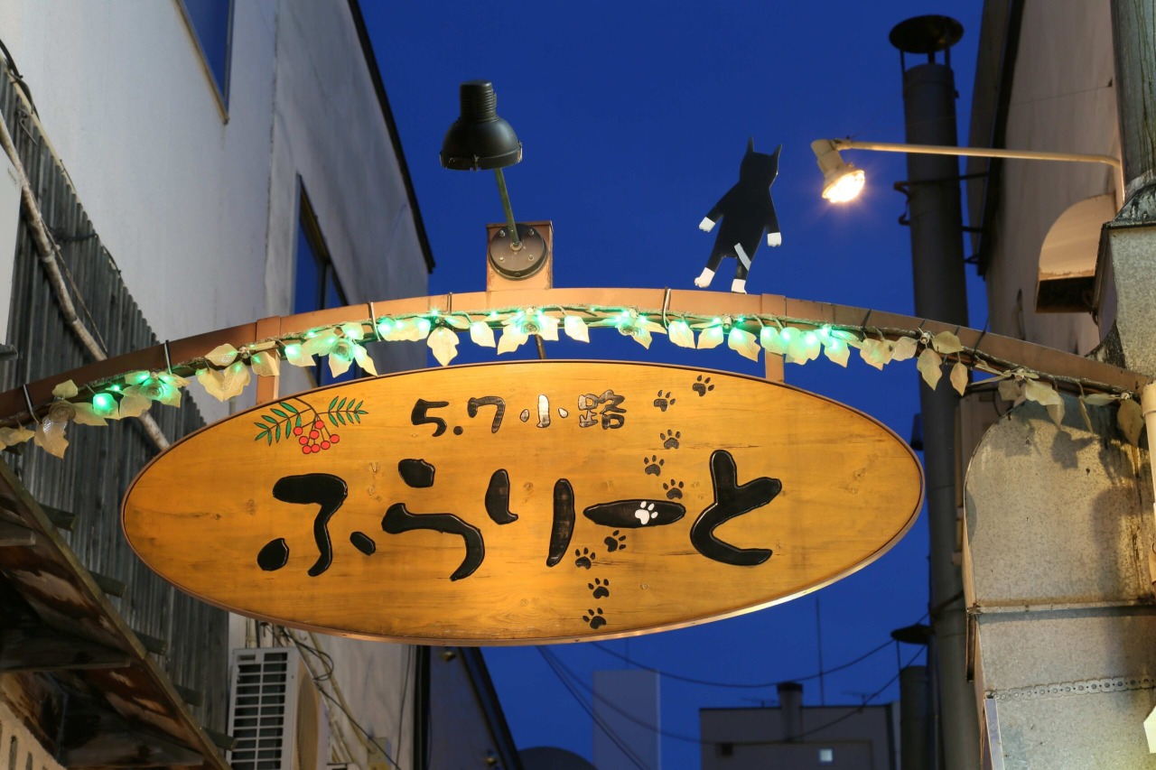 大正9年(1920年)に中央市場として発足した歴史を持つ「5・7小路 ふらりーと」は、一歩足を踏み入れると昭和初期の風景が広がります。狭い敷地にひしめき合う木製の看板や、頭上で揺れる吊り提灯の柔らかな光は、どこか懐かしい趣を感じさせ、路地全体に温かい活気を与えています。