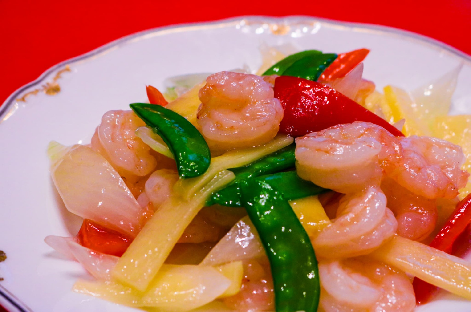 這道菜豪邁放入許多大蝦仁製成。蝦子與洋蔥的白,搭配荷蘭豆的綠、甜椒的紅及竹筍的黃,色彩繽紛,光是視覺上就令人食指大動。實際品嘗後,能在清爽的鹹味中,感受到蝦仁與蔬菜的甘甜鮮美。